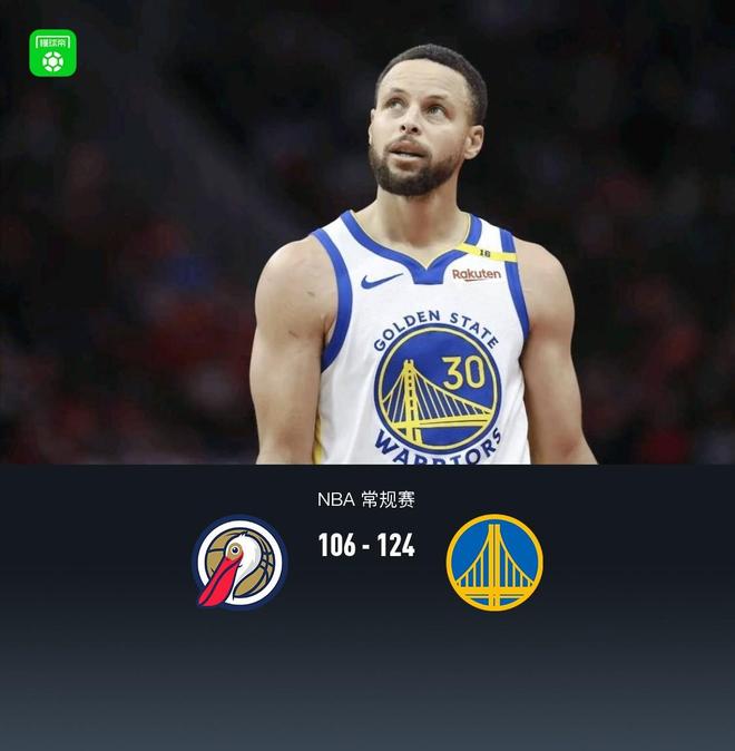 第四节,开节段勇士穆迪、巴特勒相继得分,鹈鹕这边给予回应,随后鹈鹕进攻断电,勇士将分差拉大至20分以上,比赛逐渐失去悬念,最终鹈鹕106-124不敌勇士。